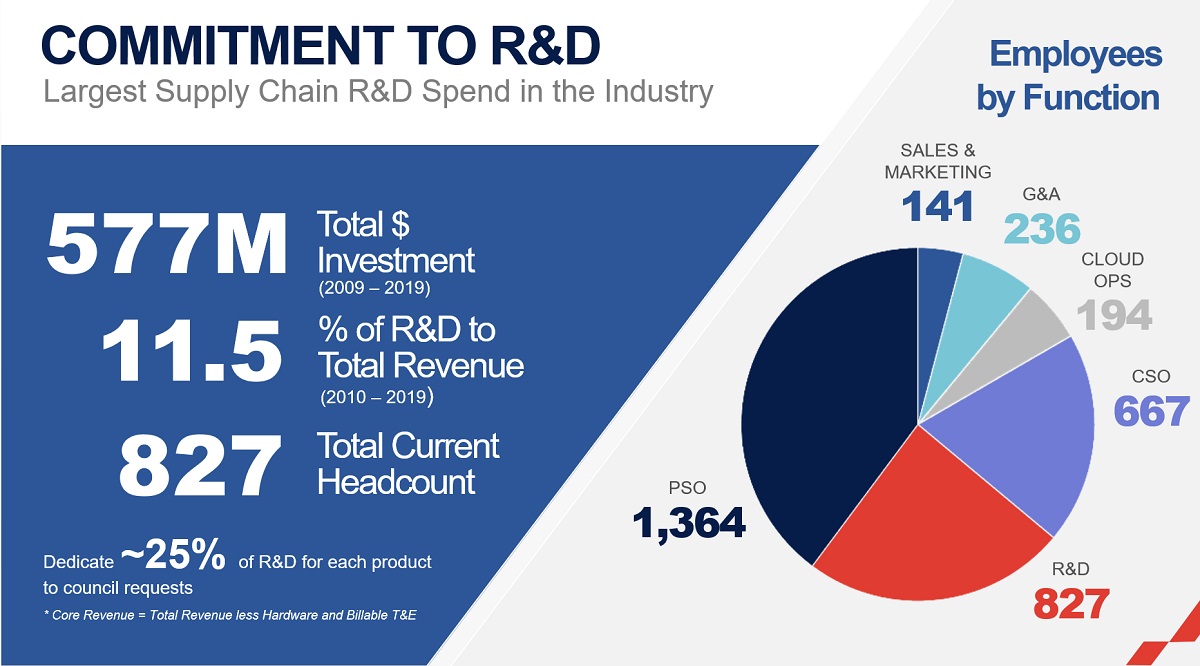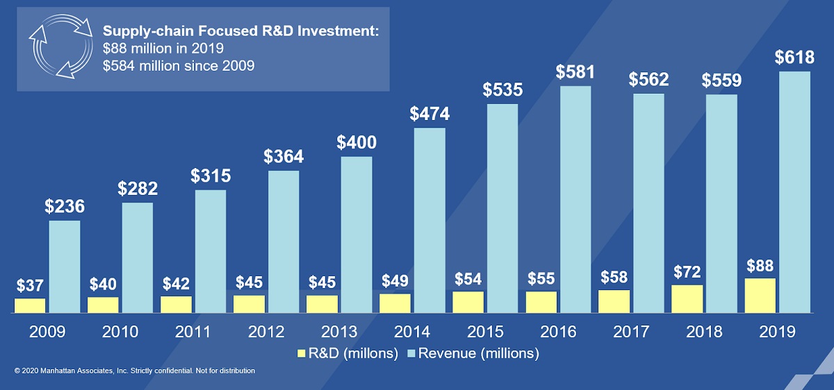 Today, Manhattan has licensed more than 1,300 customers across 2,500 facilities worldwide, including some of the world’s leading manufacturers, distributors and retailers. We have grown to be the leading supply chain software and service provider, rounding out 2019 with $618 million in total revenue. With an investment of more than $584 million dollars since 2009, our commitment to research and development continues to exceed that of other supply chain solution providers.